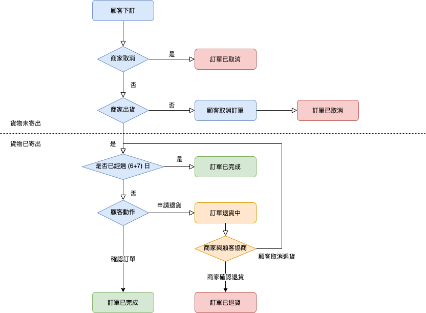 - 已完成: 顧客確認有收到, 完成確認 or 商品出貨後(6+7)天後自動完成